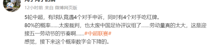 中足联这个处罚决定一出炉,就引起海港方面的不满,上港球迷纷纷贴图反讽,跟队记者也不闲着。记者陈华在个人社交平台上写道:“5轮中超,有球队竟遇4个对手申诉,同时有4个对手吃红牌。”接着表示这让评议组的劳动量太大了(下图)。